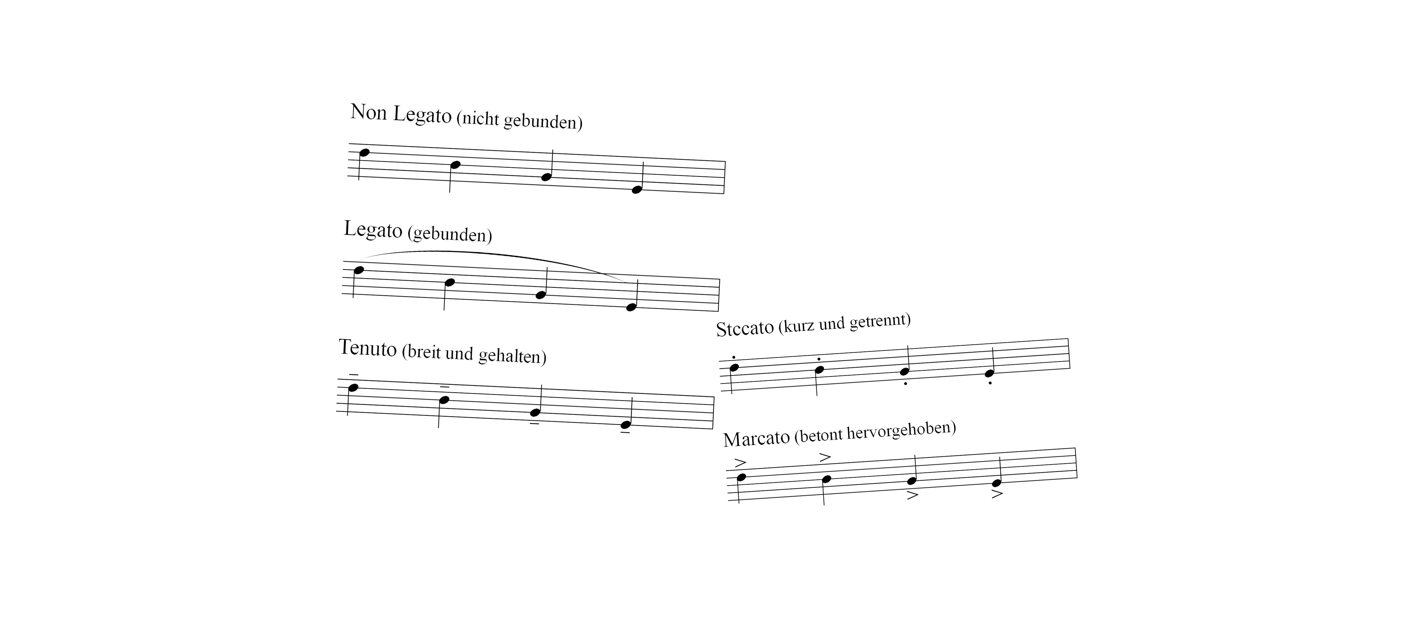 - Artikulation & Dynamik: Staccato, legato, laut oder leise – das sind keine Fremdwörter, sondern konkrete Spielanweisungen. Das sind die Gewürze in der Musik. Erst durch die unterschiedliche Artikulation und Dynamik wird eine Melodie lebendig und unverwechselbar.
